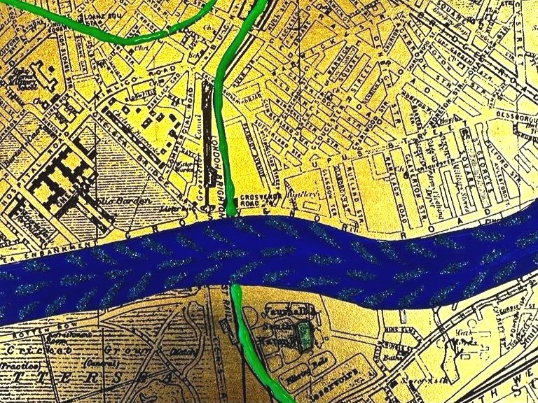 Green created a series of London maps inspired by archival records from the late 19th century - a time when London underwent a rapid transformation, becoming the largest city in the world. She has highlighted some of the city’s most significant landmarks with diamond dust, and the entire map is lavished in 24k gold leaf. The river has connected London politically, socially and economically to the rest of the world for thousands of years. It symbolises the flow of goods, money and people over time. The artworks not only captures a specific place but also evokes a sense of timelessness and the river's role as a lifeline, a source of inspiration, and a symbol of the city's rich history and dynamic present. Green created a series of complementary pieces depicting cherished and iconic buildings from across the capital including the Beaumont itself.